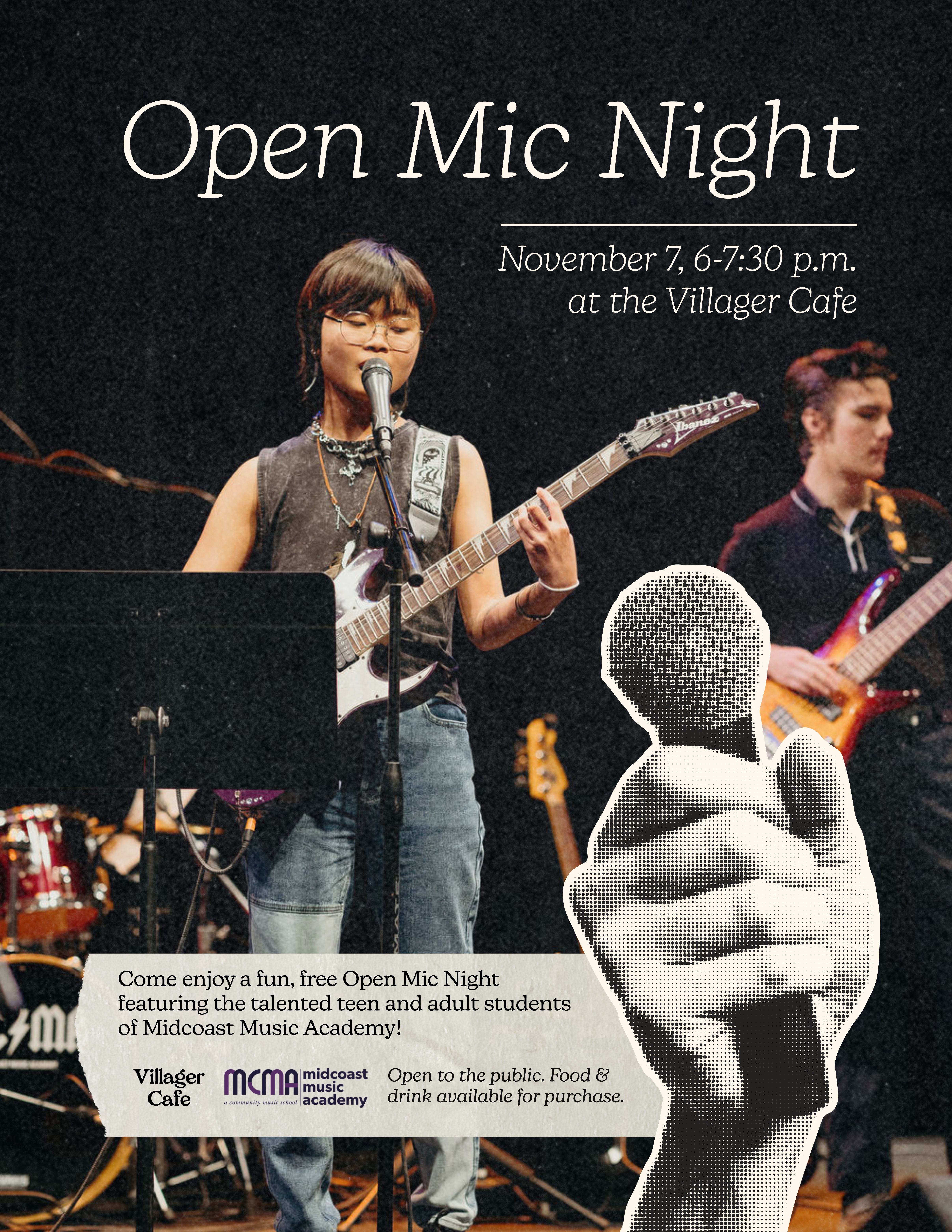 We're thrilled to present Midcoast Music Academy's first student open mic in much too long, in partnership with our friends at the Midcoast Villager. Enjoy music by MCMA students and faculty - from jazz to classical to punk rock - in the café's warm, welcoming community space. All are welcome! |