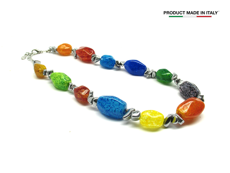 Murano Glass Necklace, Mod. Rainbow (45 cm) made with beads 17 mm in diameter, available in multicolors, with insertions foil, in Silver 925 and Gold 24 kt, made entirely handmade by Murano master glass-makers with the lampwork technique, in our Factory in Murano Venice - Italy.