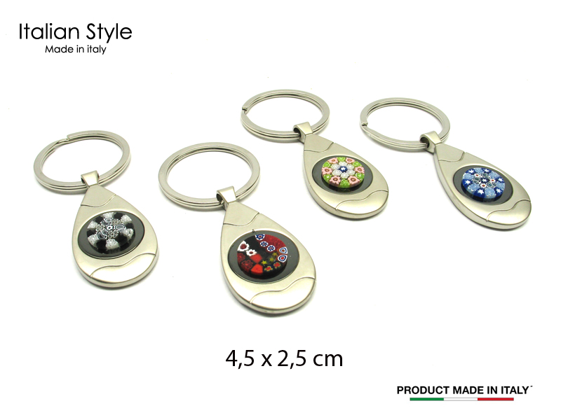 Murano Glass Keychain and Murrina insertions 16 mm, Mod. PC003 ( 45x25 mm in diameter) available in 20 Assorted Colors, made entirely handmade by our Murano master glass-makers with Murrina's Glass technique, in our Factory in Murano Venice - Italy.