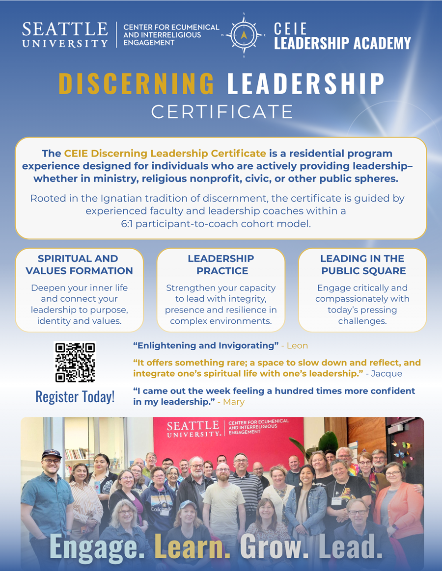 All are welcome! Register Here. | | Seattle University Summer 2026 Cohort Registration Open | | Come to the Seattle University campus for their popular summer program designed to help you grow in all aspects of your leadership. Engage with a cohort of leaders from religious, non-profit, and public sectors. Experience a learning environment rich in diversity and wisdom. Connect with Spiritual director/Coaches in small cohorts to support your discernment throughout the week.