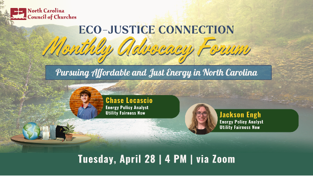 Tuesday, April 28, 4 - 5 p.m. (Online) Join our Eco-Justice Connection initiative for our monthly Advocacy Forum, held every fourth Tuesday at 4:00 p.m. Each session features a special guest speaker addressing key eco-justice and advocacy issues impacting North Carolina.