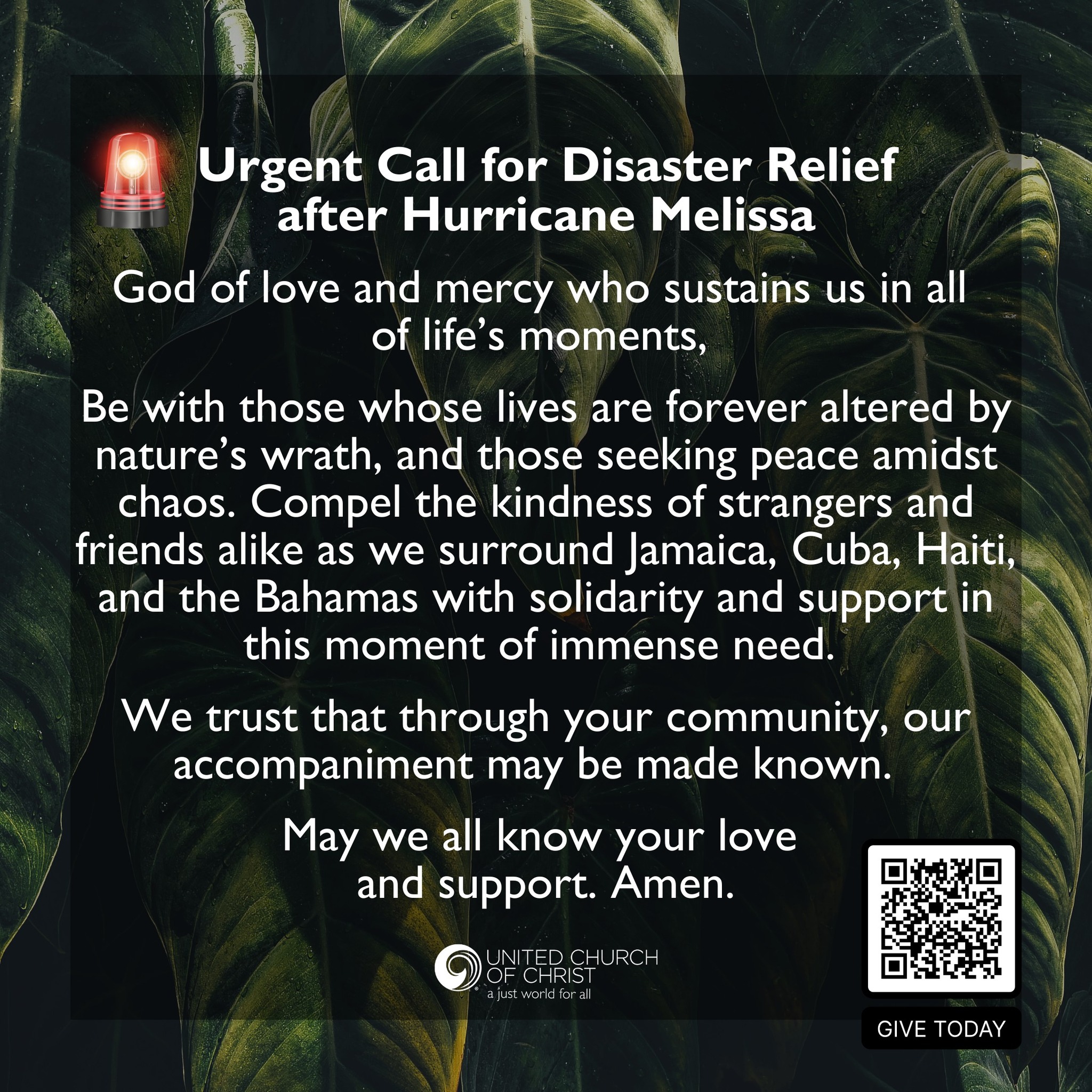 Dr Andrej Jeftić, director of the WCC Faith and Order Commission, referred to the remarkable days spent together. “Over these five days, we have been weaving something together: Our words, our actions, our prayers, and our pilgrimage into the beautiful fabric of this conference,” he said. | | | | | | UCC Appeals for Help Needed for Jamaican Disaster Relief Efforts | | On October 28, Hurricane Melissa made landfall in Jamaica as a Category 5 storm, one of the most powerful and destructive storms on record in the Caribbean. Its devastation also impacted Haiti and Cuba. Presently, 13,000 people in Jamaica remain in shelters, and 34 fatalities have been reported — a number that is expected to rise as search and rescue efforts continue. Authorities in Haiti report 25 fatalities, with that number also expected to rise in the coming days. UCC is issuing an appeal to help immediate and long-term recovery efforts in these Caribbean countries. The primary needs at this stage of recovery are shelter, safe drinking water, sanitation, healthcare, and food. Please consider donating to support these recovery efforts. UCC partners will use your support in the areas of greatest need. Through ACT Alliance and Church World Service, the UCC is working to get resources for those who need them. Through Global Ministries, we are also in contact with UCC's partners in Jamaica, Cuba, and Haiti and are working quickly to accompany and support their response efforts.