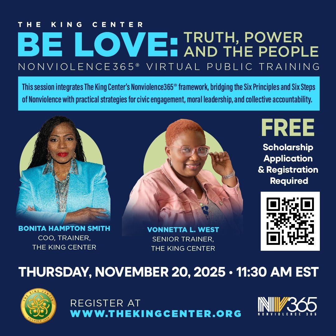 May these reflections draw you closer to the One who has come — and will come again — illuminating our path with faith, hope, and love. The North Carolina Council of Churches staff offers this free digital resource as you move into the Advent season. | | | The King Center to Host Virtual Nonviolence365® Virtual Public Training | | Join The King Center for a free virtual workshop, “Be Love: Truth, Power and the People.” Flyer and registration will be at the bottom of the email. Please share with others!