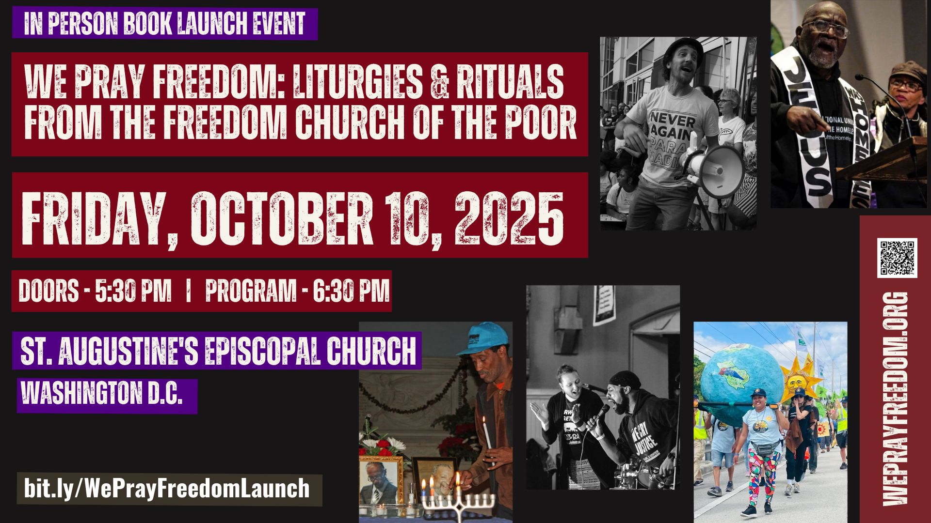 | 'We Pray Freedom' Book Launch Event | | Join Freedom Church of the Poor for an in-person launch event, We Pray Freedom: Liturgies and Rituals from the Freedom Church of the Poor. Participants gather for an evening of healing, remembrance, and collective action—lifting up the prayers, songs, and rituals that sustain their movements for justice. Help Kairos Center spread the word—invite your friends, family, and comrades in struggle to be part of this powerful celebration!