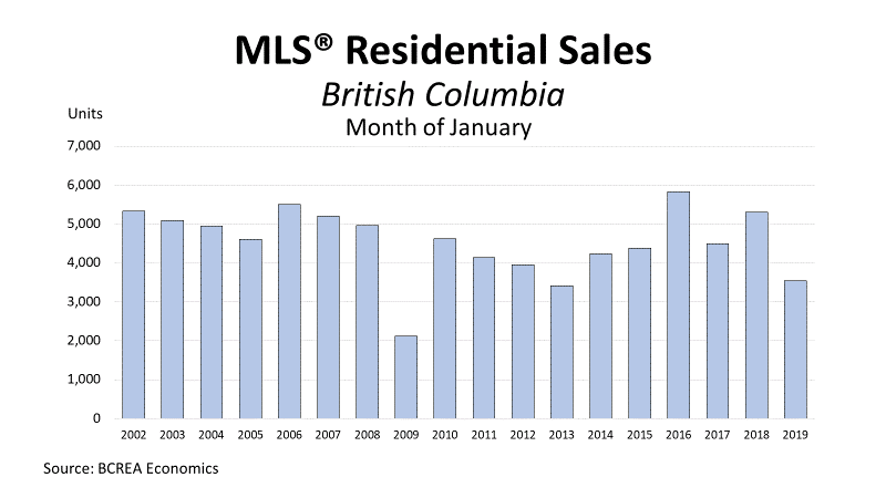 Vancouver, BC – February 15, 2019. The British Columbia Real Estate Association (BCREA) reports that a total of 3,546 residential unit sales were recorded by the Multiple Listing Service® (MLS®) in January, a decline of 33.2 per cent from the same month last year. The average MLS® residential price in the province was $665,590, a decline of 7.7 per cent from January 2018. Total sales dollar volume was $2.36 billion, a 38.4 per cent decline from the same month last year.