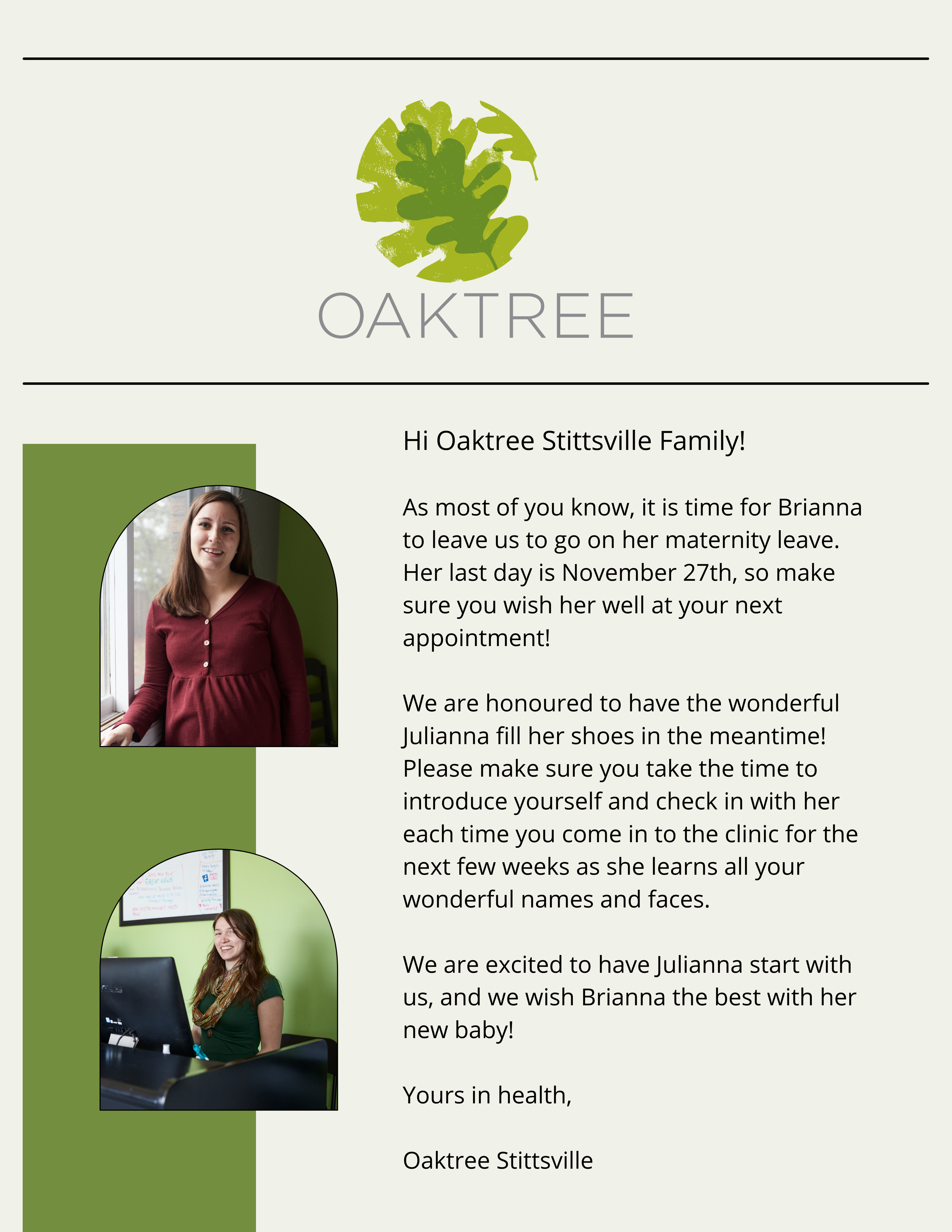 Wishing Brianna well on her mat leave, and welcoming Julianna!