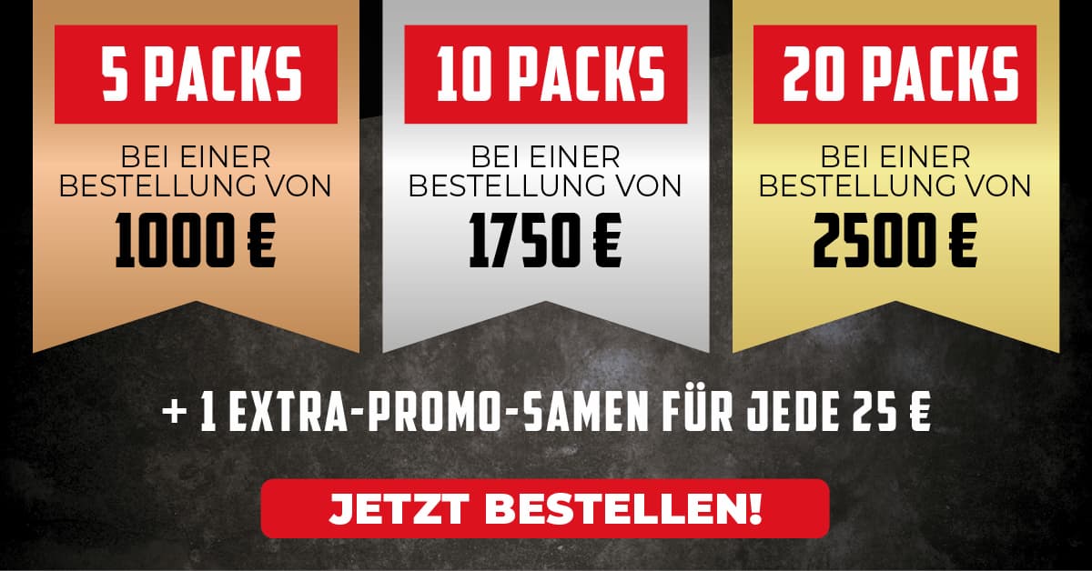 Jede Box enthält: Gratis Saatgut zum verkaufen oder behalten. Paradise Merchandise Aufkleber und Papierchen. 1 Promo Samen (Verkaufsschlager) je €25 Einkaufswert.
