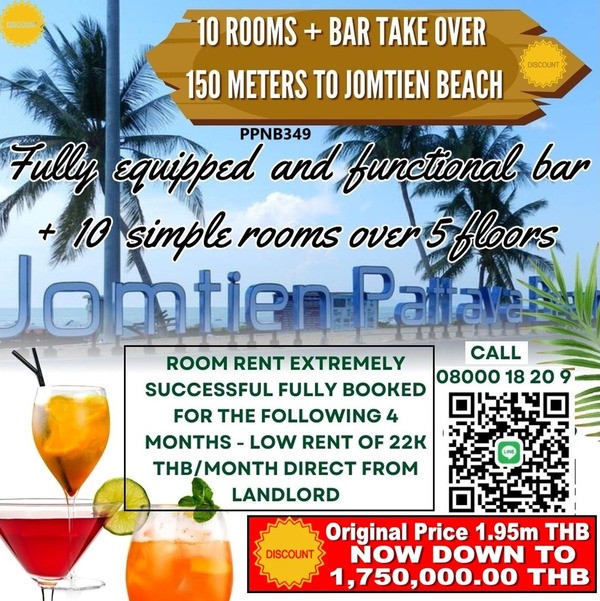 | | 10 Rooms + Bar Take Over in Jomtien DISCOUNTED Super located less than 150 meters from Jomtien beach Ground floor has a large outside useable space for seats Inside a fully equipped and functional bar with POS system Behind a small, equipped kitchen before used as restaurant Single building has 4 large + 6 smaller rooms spread over 5 floors All simple but renovated rooms have new fridges, TV’s Owner also provided new sheets, bedding extra in stock Business up and running making money every day of the week Room rent extremely successful via different booking agencies All rooms as good a fully booked for the following 4 months Low rent of 22k THB/Month direct from landlord, 3+3+3 years Take over selling 1.95m THB all included, turnkey business! SPECIAL DISCOUNTED TO 1.75m THB all included!!! Contact Information: Pattayapropertynetwork@gmail.com Call: 080-001-8209 or 0614345637