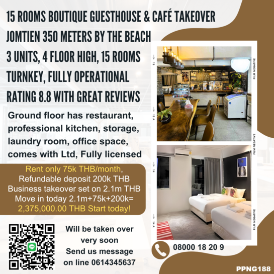 | | 15 Rooms Boutique Guesthouse & Café Takeover Jomtien On main road between 2nd road and beach road 100 meters to the public transportation, 350 meters by the beach Massive passing by traffic being locals, residents and tourists Entertainment is all close by still in nights very quiet area Building has 3 Units, 4 Floor high, 15 rooms, 20 bathrooms It is possible to extend the number of rooms from 15 to 18 units Turnkey, fully operational guesthouse and café, all licensed Boutique Guesthouse & Café rating 8.8 with great reviews Ground floor has restaurant, professional kitchen, and storage Laundry room, office space, comes with Ltd company to run it Clean documentation, taxes paid on time, net profit 1.5m THB/year Easy to extend and increase profits by simple actions Reason for selling is that the owner starts large-scale projects in Bangkok In takeover is all equipment, furnishings, and branding included Rent only 75k THB/month, Refundable deposit 200k THB Business takeover set on 2.1m THB Move in today 2.1m+75k+200k= 2,375,000.00 THB Start today! Business and building are for sale for 36m THB all included Call 08000 18 20 9 or Line message us via 0614 3456 37