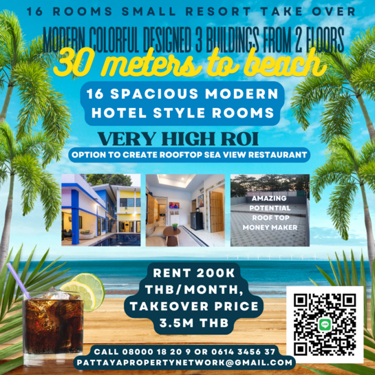 | | 16 Room Pool Resort near beach to Take over Superior is located 30 METERS from the beach New modern colorful designed with swimming pool Private entrance go to pool and 3 buildings from 2 floors 16 rooms are spacious, modern amenities, and comfortable Rooms with flat-screen TV, safe deposit box in hotel style Some are double rooms, family rooms, have work desk Clients are holiday makers, long term stay Families and groups rent 1 or 2 or even all buildings ROI is extremely high, can be proven to real buyers EXTRA TO CREATE A ROOFTOP SEA VIEW RESTAURANT Rent 200k THB/month, takeover price is set on 3.5m THB Call Khun M via 08000 18 20 9 or 0614 3456 37 or email pattayapropertynetwork@gmail.com