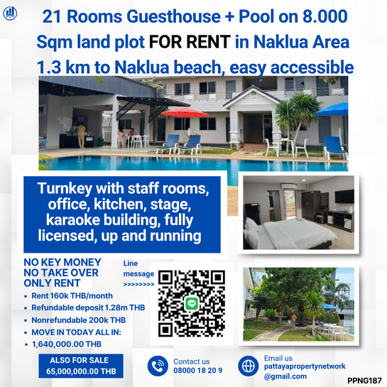| | 21 Rooms Guesthouse + Swimming Pool on 5 rai FOR RENT Located in the Naklua area 300 meters from public transport 1.3 km to Wongamat beach, 2 km to Mini Siam, 3 entrances Property on a large 5 Rai or 8.000 Sqm, space for extensions Ideas: tennis courts, extra bungalows, possible to build more 3 floor high building with 21 large rooms, swimming pool in front Each room is a comfortable hotel room useable for long-term stay Second building has office, reception, kitchen, and covered stage Other extra building has 3 staff rooms plus karaoke party hall, garden Perfect setting up for family and private groups parties. Mini bar Fully licensed Business, turnkey up and running, high occupancy Renting contract is for 3+3+3 years direct from the owner Take over include Company LTD to run it NO KEY MONEY INVOLVED, NO TAKE OVER, JUST RENT Rent 160k THB/month Refundable deposit 8 months 1,280,000.00 THB Nonrefundable security deposit 200,000.00 THB Move in today: 160k + 1.28m + 200k = 1,640,000.00 THB THERE IS NO DISCOUNT ON THIS RENT OFFER!!! This property is for sale for 65,000,000.00 THB Contact via 08000 18 20 9 or line message us via 0614 3456 37