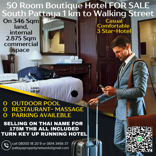 50 Room Boutique Hotel for Sale South Pattaya 1 km to Walking Street, 3 km to Jomtien beach Close to the main road, easily accessible for buses Build over 5 floors is ranked 3-star boutique hotel On 346 Sqm land, internal 2.875 Sqm commercial space 50 Casual hotel style rooms feature wood floors/furniture Hotel offers an outdoor pool and hot tub, restaurant Entertainment space with billiards and massage room. Selling price on Thai name 175m THB All included Call 08000 18 20 9 or 0614 3456 37 Email pattayapropertynetwork@gmail.com
