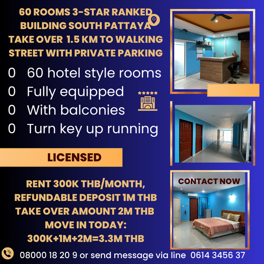 | | 60 Rooms Apartment Building South Pattaya Take Over Located 1.5 km to Walking Street, 500 meters to 3the road 2 km from Pattaya viewpoint, near local market Has private parking on site, ground floor has bar Ranked as 3-star apartment, 60 hotel styled rooms All fully furnished and equipped with balconies Each unit features work desk, minibar, and TV. On site: minimarket, hairdresser/beautician, room service Rent 300k THB/month, refundable deposit 1m THB Take over amount 2m THB all final prices Move in today: 300k+1m+2m=3.3m THB Contact via 08000 18 20 9 or line message us via 0614 3456 37
