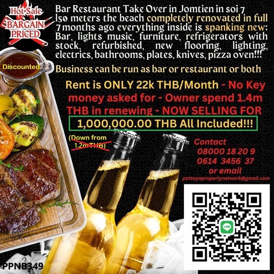 | | DISCOUNTED Small Bar Take Over in Jomtien Soi 7 near Beach Hardly 150 meters from Jomtien beach All is completely renovated in full 10 months ago Everything inside is spanking new: Bar, lights Music, furniture, refrigerators with stock, refurbished New flooring, lighting, electrics, bathrooms, New equipment plates, knives, pizza oven Next owner can run as bar or restaurant or both Bar is up and running now with staff present and stay if wanted Expenses: Electric 4.5k THB, water 800 THB, Wi-Fi 1.6k Owner spends 1.4m THB, now selling low priced for health reasons Rent only 22k THB, selling price was 1.2m THB, all included NOW TEMPORARY DOWN TO 1m THB ALL INCLUDED!!! Contact Information: Pattayapropertynetwork@gmail.com 080-001-8209 or 0614 3456 37 ลงทุนต่ำ คืนทุนเร็ว! บาร์จอมเทียน ซ.7 รีโนเวทใหม่ ใกล้ทะเล ค่าเช่าถูก 22,000 บ./ด. ขายด่วนเพียง 1 ล้าน รวมหมด
