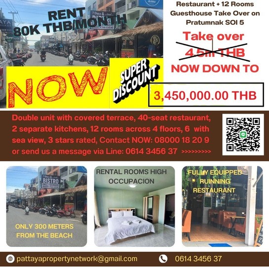 Pratumnak Soi 5 – Discounted Business Takeover Secure a rare investment in Pattaya’s most sought-after district. This restaurant + 12-room guesthouse is located just 300 meters from Royal Beach, directly on the main street. • Double-unit property with covered terrace, open and running business • 40-seat restaurant with two professional kitchens (indoor & outdoor) • 12 fully furnished rooms across 4 floors (11 guest rooms + 1 maid room) • 6 rooms with direct sea views • Recently renovated, 3-star rated standard • Current rental fee: Only 80,000 THB/month • Takeover price: 4.5M THB turnkey – limited offer 3.45M THB this month only 📞 Contact: 08000 18 20 9 | Line: 0614 3456 37 | ✉️ pattayapropertynetwork@gmail.com