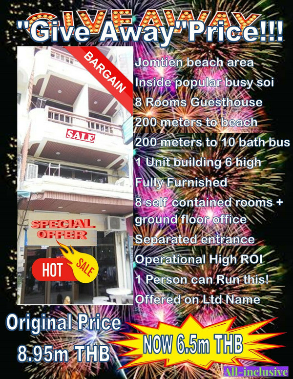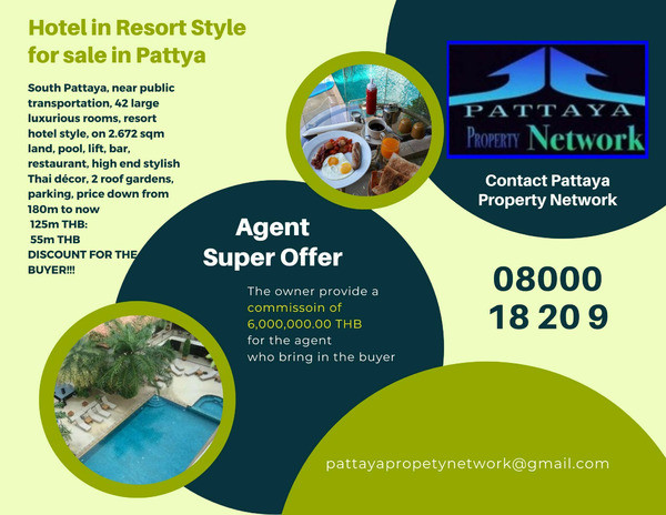 The 6m THB commision in full if you bring in the buyer for this resort hotel ends up 31 January 2023 midnight. All clients send before this date midnight will still get the 6m THB commission. After this date, the commisison will drop to 3 percent. Also the sales price will drop for the buyer. Act NOW !!!