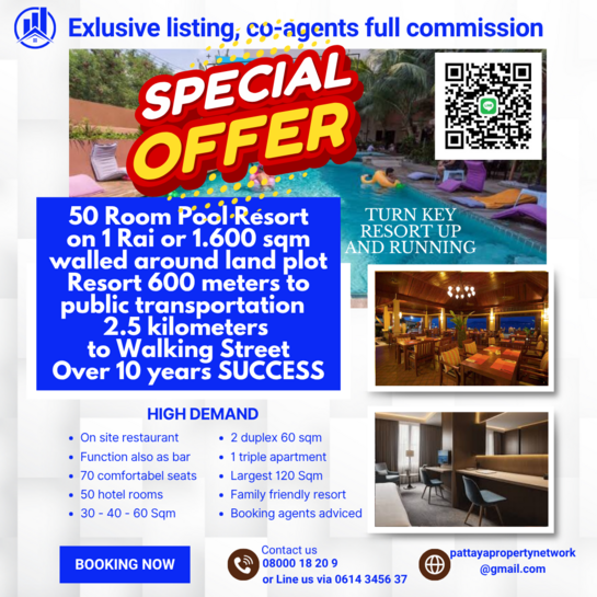 | | Pattaya 50 Room Resort SUPER DISCOUNTED This resort came down in price from 85m THB to now 65m THB, in brief: 2.5 kilometers to Pattaya beach, on 1 Rai of land or 1.600 sqm, Fully equipped restaurant with 70 seats, 13x7 meters Swimming pool, Jacuzzi, covered car park, Motorbike park, wide walkways, hotel license in progress, 48 hotel rooms in different sizes: 40 studio rooms 30 Sqm, 5 Suites 60 sqm, 2 duplex 60 sqm, 1 triple apartment (2 bed, 1 living, 1 terrace) 120sqm, 1 room used as office and 1 rooms used by staff. All rooms fully furnished, high end interior, successful running for 10 years. The original price was 85,000,000.00 THB but now due to urgent private reasons for sale for only 65,000,000.00 THB with NO more discount options. The owner refuses any contact for this please respect this. It is not allowed to go there and approach the staff because of discretion towards them and towards clients. To view this resort, the buyer must identify him of herself and need to show a proof of funds, without proof of funds there will be no viewing allowed. Call 08000 18 20 9 or send Line message to 0614 3456 37.
