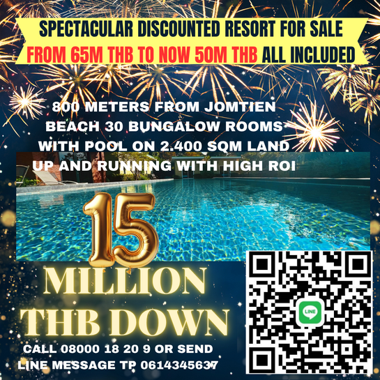 | | Resort with SPECTACULAR DISCOUNT for Sale 800 meters from Jomtien beach, 30 rooms with pool Resort with pool built on 1 Rai 2 ngan or 2.400 Sqm Onsite restaurant provides meals, and has large parking 3-star, 30 comfortable bungalow rooms, turnkey up and running They have twin and double rooms, and some pool access Original price is less than land value: 65m THB NOW TEMPORARY SENSATIONSL SUPER DISCOUNTED Selling on Thai name NOW FOR ONLY 50m THB all included This is a very urgent sale, matter of days, act now! Contact via 08000 18 20 9 or line us via 0614 3456 37