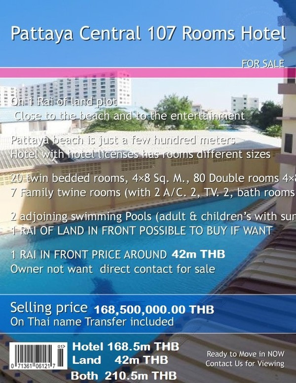 Hello Friend, Sometimes real estate agents need to face a problem and cannot sell a commercial property and they do not know why. But in this case the clients provide us the solution. This 107 room hotel with pool and lift off Third road had several viewings, specially by Chinese investors and all came up with the same reason NOT to buy. In this offer they all told us that it is difficult to impossible to stop with the tour bus in front of the hotel and there is no option to park the busses anywhere. After a meeting with the owner we came up with the solution…we will buy the 1 rai in front of the hotel and make it into a large entrance with parking: Solution Found!!! The price will be higher because we have to purchase the land in front but the result is perfect for most of the investors aiming at groups travelers arriving by tour buses.