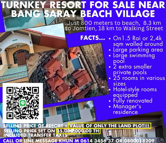 | | 🔑 Turnkey Resort for Sale near Bang Saray Beach 🌴 Just 800 meters from a local tropical beach 🏖️ 8.3 km to Jomtien Beach, 18 km to Walking Street 🏡 Built on 1.5 Rai (2,200 sqm) of walled land 🚗 Large parking, 1 large swimming pool + 2 smaller swimming pools 🎉 Pools have BBQ facilities, outside showers, party options 🏨 Ideal for a tourist resort, private property, or wellness center 🎉 Perfect for a pool party business or weekend rental business 🏢 25 rooms in various sizes: studio, 1, 2, 3, and 4-bedroom units 🛏️ Hotel-style rooms fully equipped to a high standard 🔧 Fully renovated and in perfect condition, fully equipped 🏢 Separate reception area and large manager's residence 🍽️ Equipped kitchen, restaurant, office space, and smoking areas 🔥 Pools with BBQ facilities, outside showers, and party options 📜 On Thai name selling for 35m THB 📧 Contact Information: ✉️ Pattayapropertynetwork@gmail.com 📞 Call 080-001-8209 or send message via Line to 061-434-5637