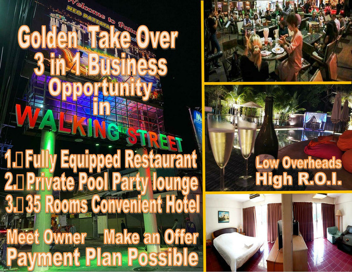 Here is the add that is running all over Pattaya: 3 in 1 Business Opportunity in Walking Street This is the best time ever to take over a business in Walking Street at super low prices and low rent to start with. The present temporary discount will cover the first few months towards opening orders. These are 3 different businesses ON Main Walking Street combined in one single offer. It had a Fully Equipped Restaurant 400 sqm plus + a Private Pool Party lounge Restaurant + a 35 Rooms Convenient Hotel. I was super Successful before with HIGH ROI and the lowest renting price in Walking Street. The original Take over Asking price was 35m THB based on the high profit marge but the present business owner is open of all offers and even can provide a payment plan. This open for all offers is only temporary because this will be sold very fast! It is only for serious buyers with proof of funds and real Potential Takeover Clients can view the businesses and meet the owner to get all the detail in full and make an offer. Just contact us NOW via email pattayapropertynetwork@gmail.com or call 08000 18 20 9 to make the viewing appointment. THE TAKE OVER PRICE IS NOT FIXED, 20m THB IS THE GUIDELINE, THE POTENTIAL BUYER CAN COME WITH AN OFFER AND A PAYMENTPLAN CAN BE OFFERED
