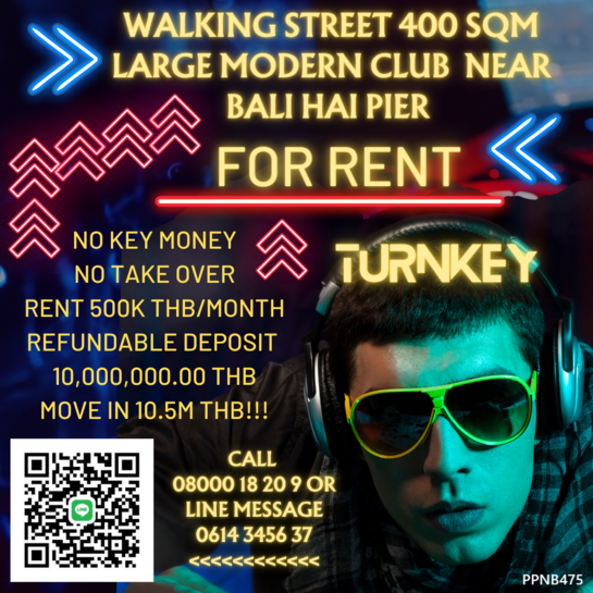 | | Walking Street 400 Sqm Large Modern Club FOR RENT Super located in Walking Street close to Bali Hai Pier Fully equipped, licensed, open and making money Unique financial: No key money, no takeover, just rent Contract 3+3+3 years, Rent is 500k THB per month Refundable deposit set on 10m THB Move in today 10,500,000.00 THB Contact via 08000 18 20 9 or line message us via 0614 3456 37