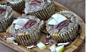 Servings: 12 Here’s what you need: ⅓ cup flax meal ½ cup Almond Meal 2 teaspoons baking powder 1 teaspoon baking soda ½ teaspoon sea salt ½ teaspoon ground cinnamon 2 eggs 2 tablespoons raw honey 2 ripe bananas, mashed 1 cup apple, finely chopped 1 cup pecans, chopped 12 apple slices 12 whole pecans