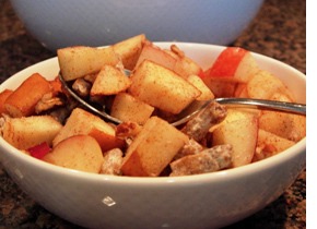 Here’s what you need... 1 white nectarine, chopped 1 pear, chopped 1 Tablespoon chopped pecans 1 Tablespoon chopped dates Dash of cinnamon