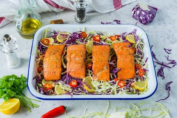 9. Place the mixed cabbage salad in serving dishes and place the cooked salmon on top.