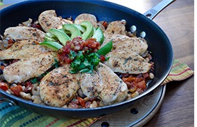 Here’s one seriously nutritious south-of-the-border skillet dinner! Most Mexican dinners contain generous portions of grains and dairy, so we’ve lightened this one up by taking out traditional rice and replacing cheese topping with fresh avocado and pico de gallo. It’s mildly spicy and very satisfying! In this skillet dinner canned beans are combined with onion and tomato to create a hearty, flavorful base for marinated chicken breasts. The whole process is really quick and simply, doing a little sautéing on the stove and then popping the skillet into the oven while you prep the toppings.