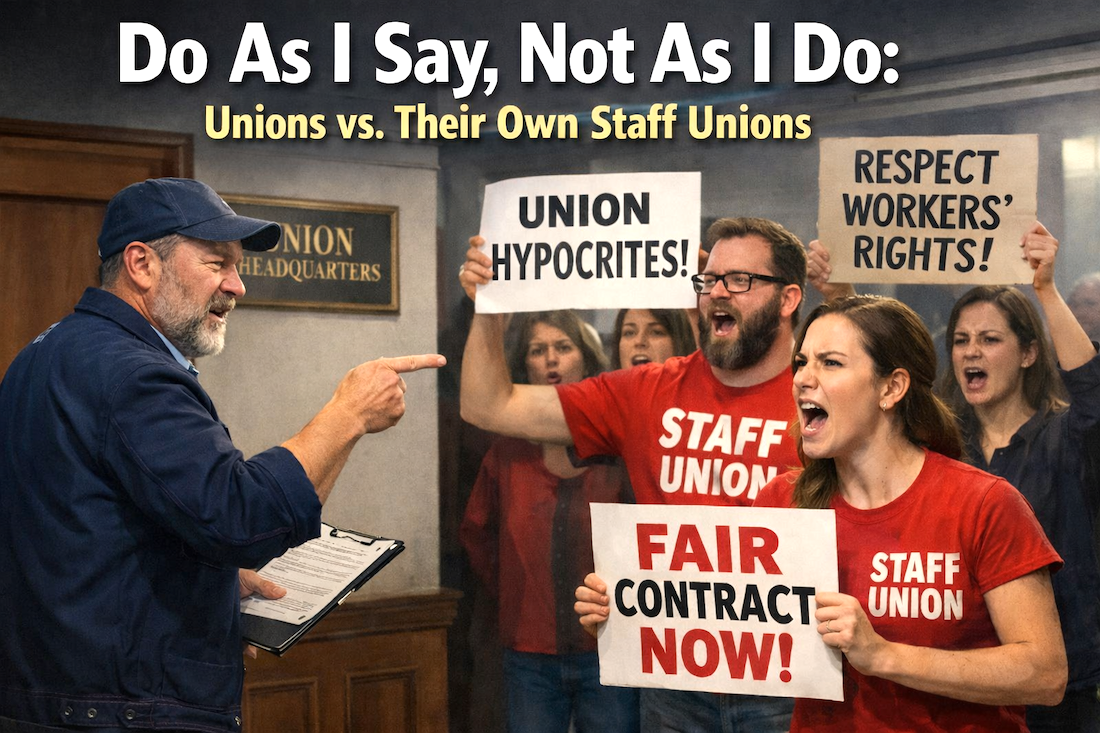 We recently told you about the Teamsters’ refusal to voluntarily recognize their own staff union for organizers, and here’s another example of a union not practicing what they preach.