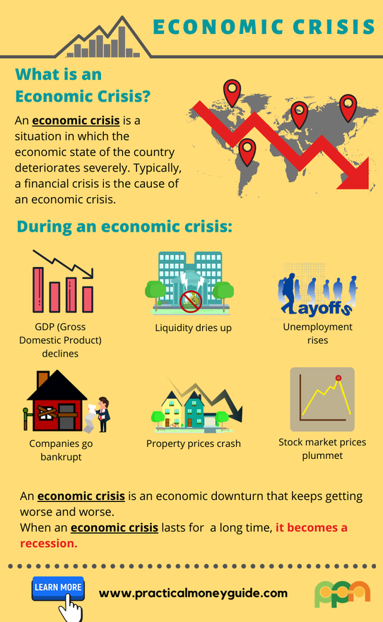 An economic crisis is a period of time when the economy collapses and money loses its value. It is the result of the collapse of international trade, drop in demand and confidence, and high inflation rates that lead to a decrease in goods and services and lower economic growth. Click to know more.