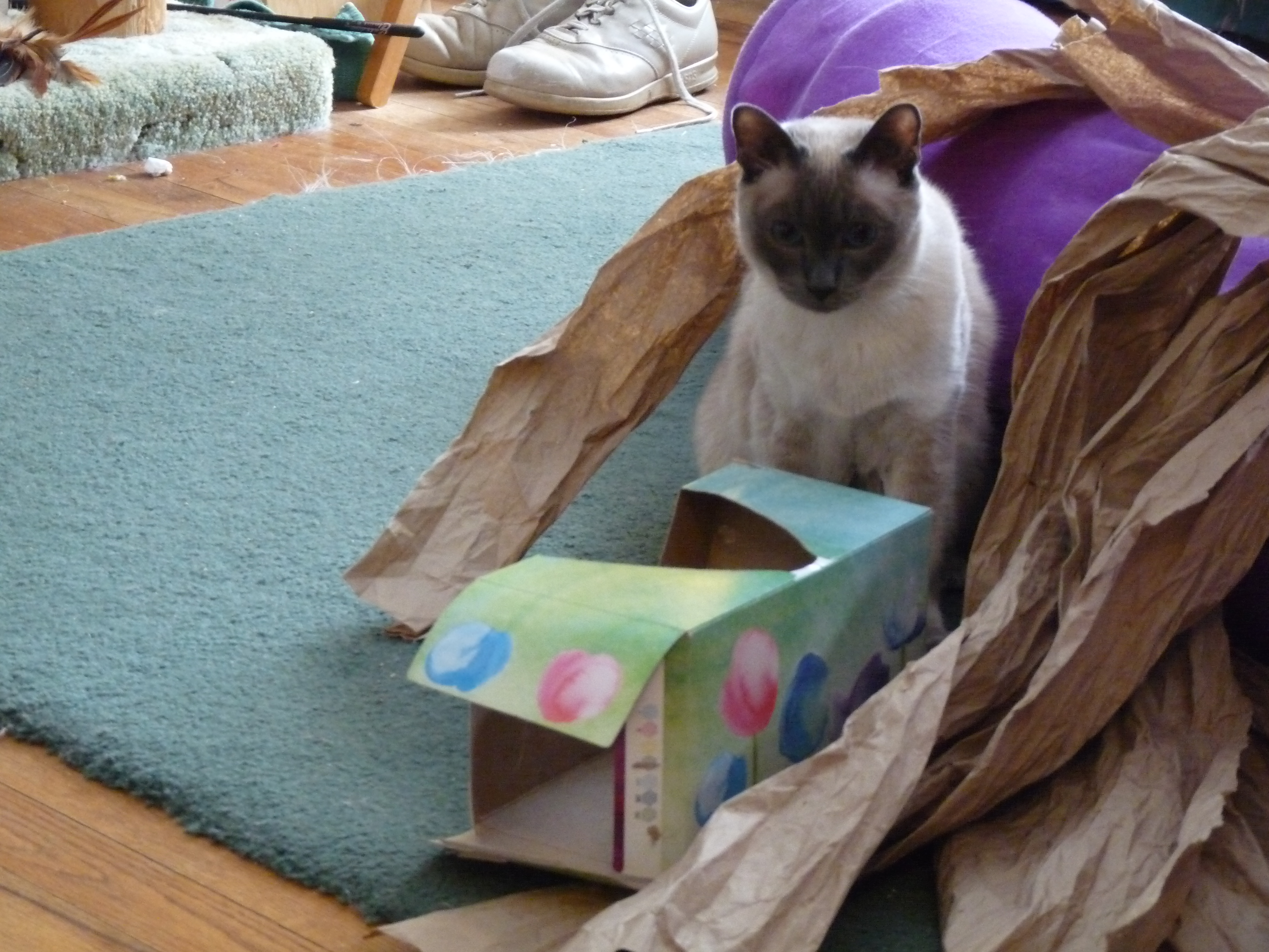 I walked into my bedroom to put clean laundry away and discovered Sakhara sitting on her haunches on my bed and Violet in a similar position on the floor. They were looking directly at each other and not moving.