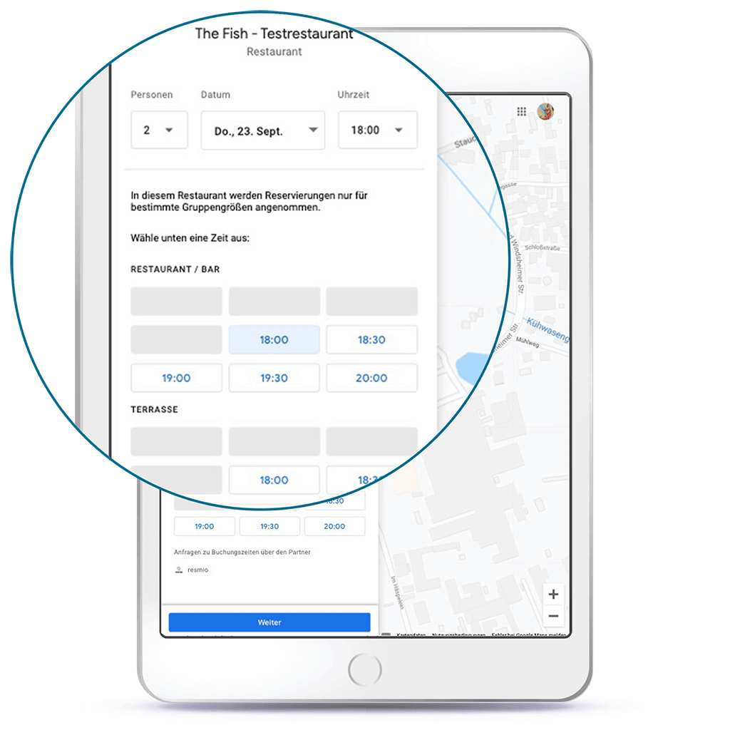 Check availability of tables in rooms – now also via Google | If you already allow guests to check the availability of tables in your rooms via our widget, we have great news! The room feature is now also available on Google. The table plan in your resmio account needs to be activated and existing bookable rooms are also requiered. Google takes over all settings from your account, including any exceptions to table availability you have possibly made (e.g. blocked outdoor tables in winter). | | How can I activate the room feature? | You can activate table bookings for rooms on Google by logging into your resmio account and checking the appropriate box under Settings (gear icon) > Integrations & connections > Google My Business.* If you do not see a setting option, your restaurant may be deactivated for the partner network. In this case, please contact our support (support@resmio.com or + 49 911 3749 230) *Please note that the adjustment may only become active within the next 24 - 48 hours. We have no influence on this.