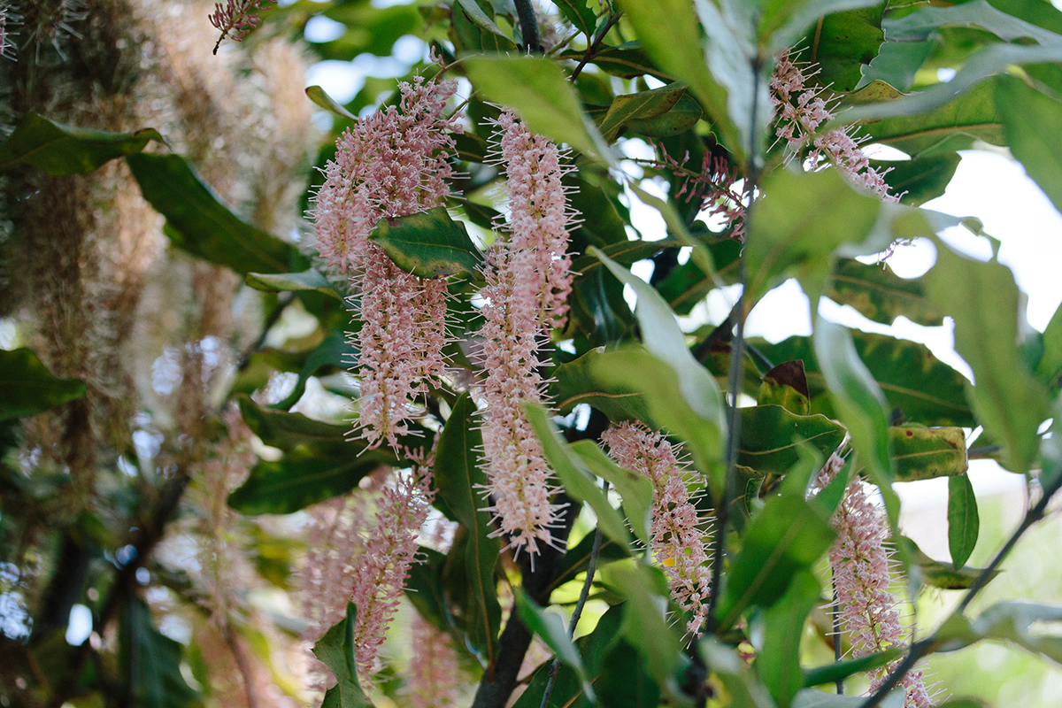 Macadamia flowering produces many white-pinkish racemes of flowers: good nectar/pollen resource for honeybees, and the industry may require pollination support. Because the flowering period is somewhat concentrated, deploying hives at the right time is critical.