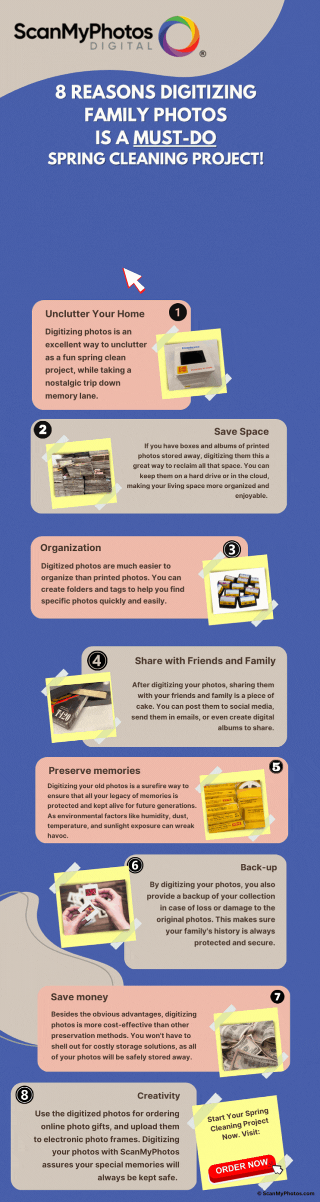 | | | 8 Tips For A Fun Spring Cleaning Project: Guaranteed | | Digitizing photos, home movies, 35mm slides, and film is an imperative spring cleaning project to declutter and ensure cherished photo memories are safely preserved.