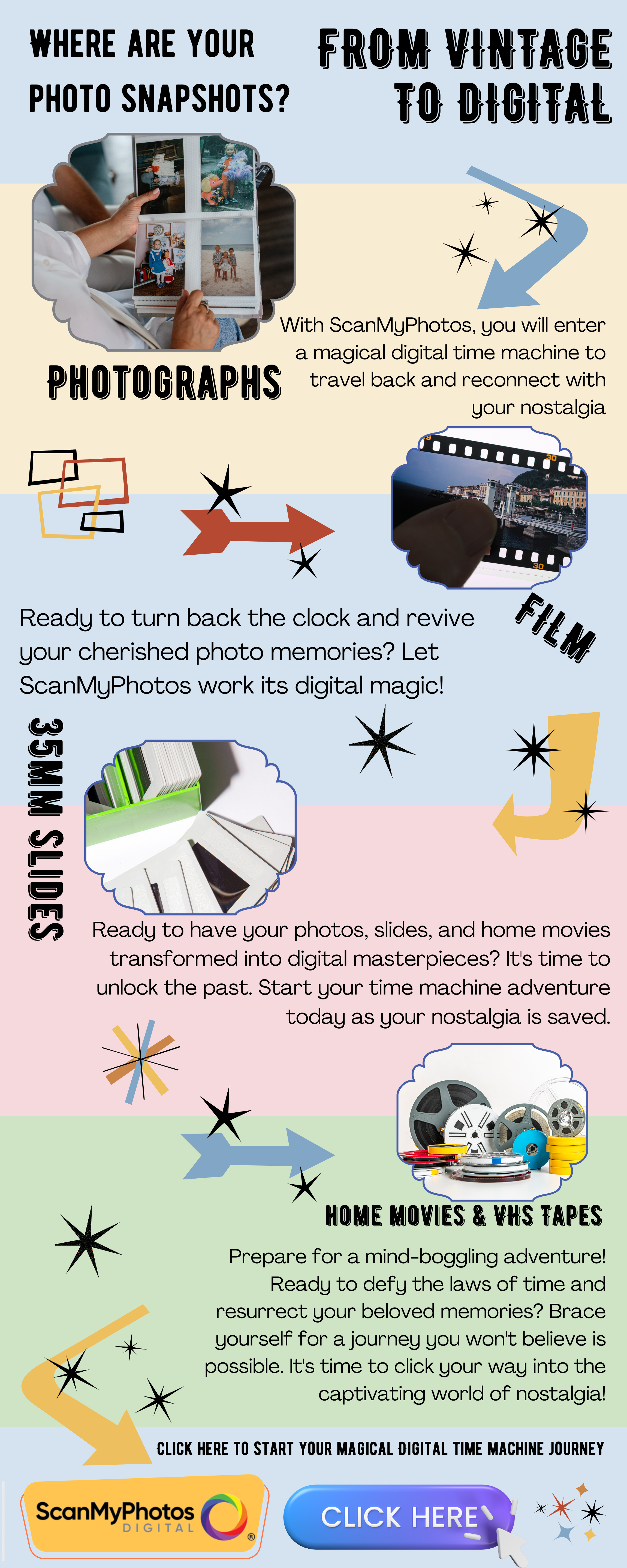 | | Do you know where your vintage photo albums are stored away? How about your boxes of 35mm slides? And those film negatives, reels of home movies, and VHS tapes? It's crucial not to let your treasured memories fade away! Fortunately, we have a remarkable solution that will ensure their everlasting safety.