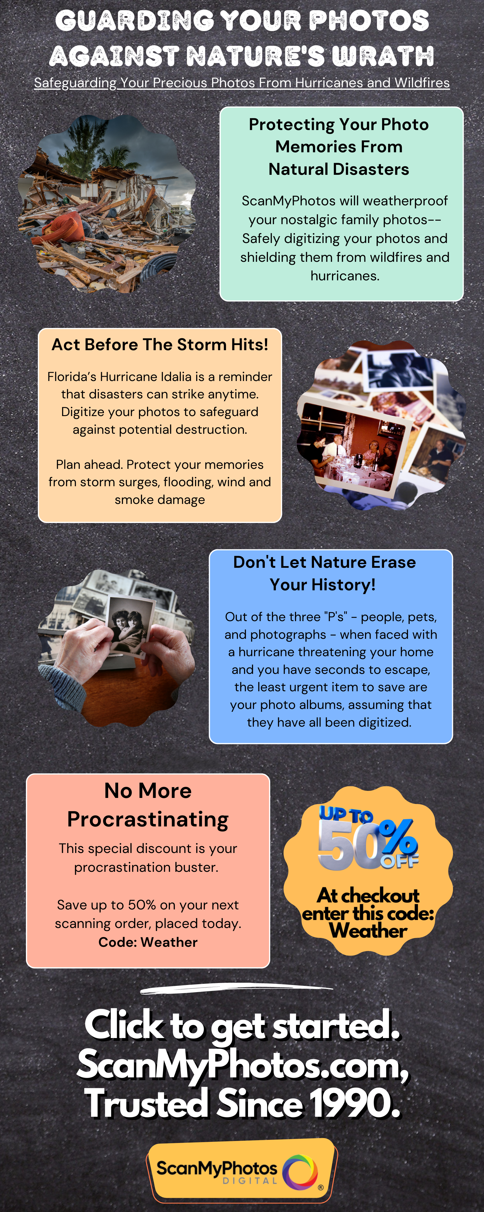 Last chance to save big and protect your pictures from natural disasters! | | Time is running out! We are on a mission to protect family history from natural disasters. Grab today's opportunity to enjoy significant savings with our irresistible offer. Make sure to unlock this fantastic discount! | | | | |