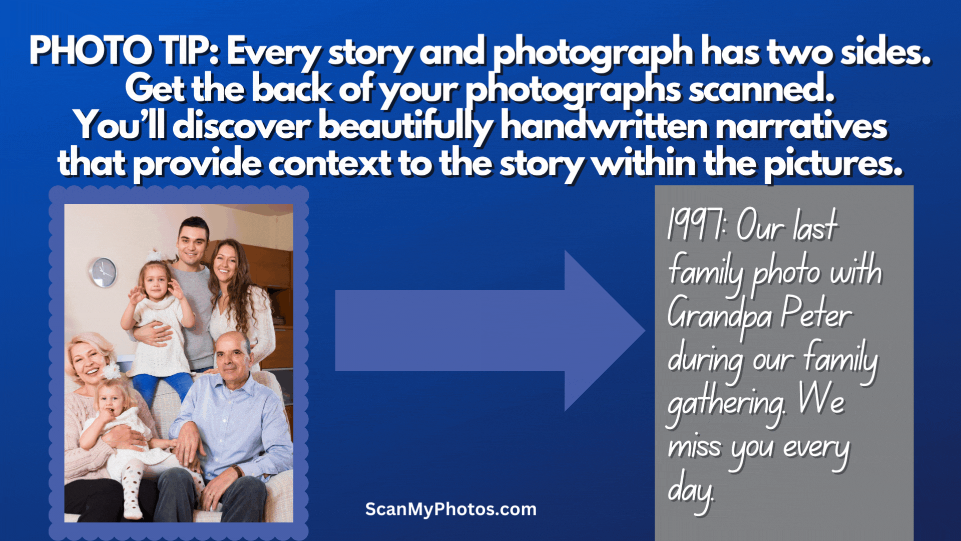 The front showcases the cherished memory frozen in time, but it's the back that often holds beautifully handwritten messages, notes, and important descriptions that complete the picture. That's where ScanMyPhotos comes in with its innovative dual-sided scanning service. It's the click of a button fast. At checkout, add "dual-sided scanning" and we digitize both sides of every picture. |