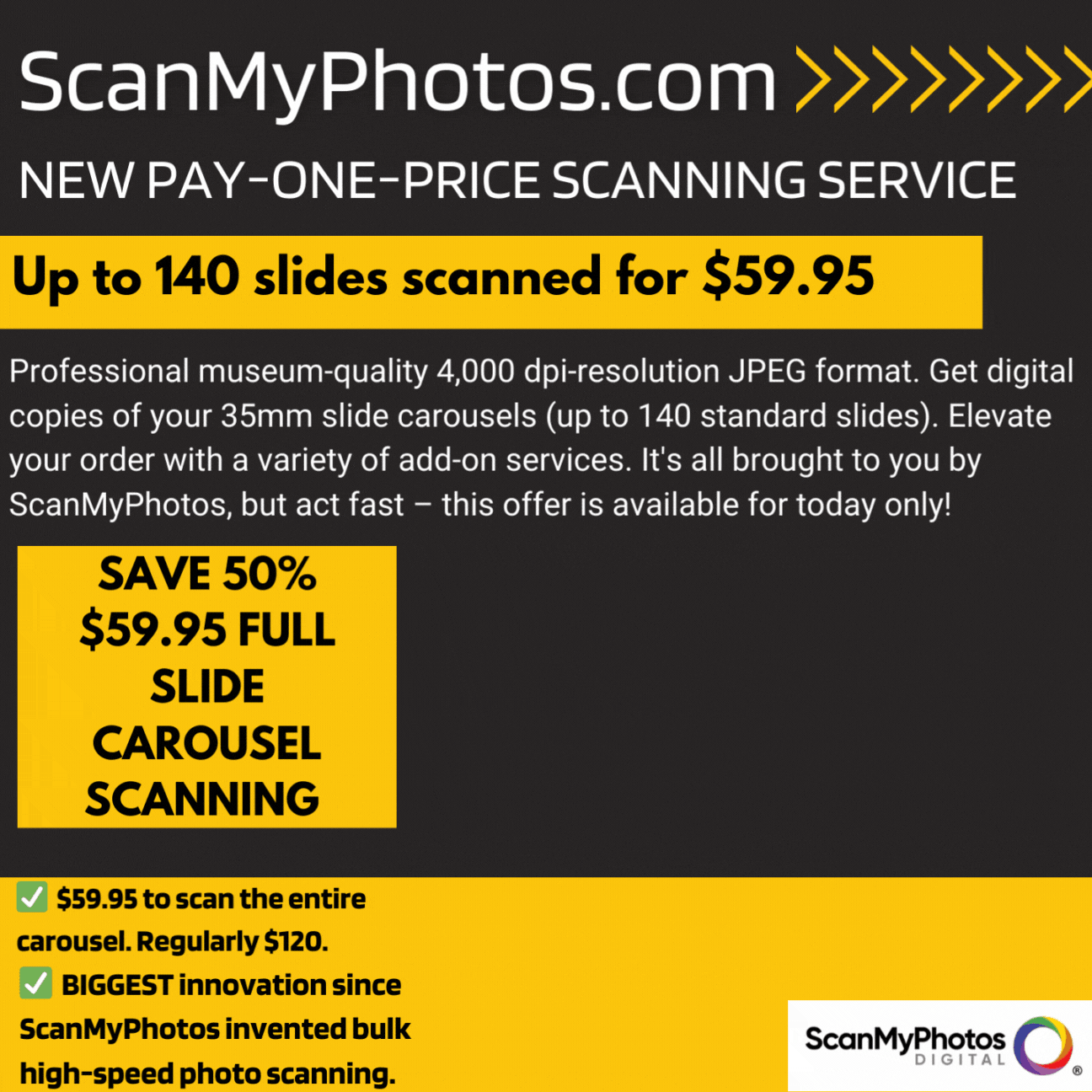 | | Discounted 50% On New Orders! ScanMyPhotos now offers a groundbreaking service to digitize entire 35mm slide carousels, unlocking forgotten family adventures and cherished memories. Today, full carousel scanning is available for just $59.95, digitizing up to 140 slides for a flat fee—your cost-effective solution for preserving the past. Updated advanced scanning technology and 4,000 dpi high-scanning to ensure museum-quality optimal results. Next, enhance your order with more add-on services, including ScanFast same-day service + instant uploading of your files to your inbox. Afterward, share your digitized slide transparencies on popular photo-sharing apps like Facebook, Instagram, Snap, TikTok, and Twitter (X)--bridging the gap between nostalgia and the digital era.