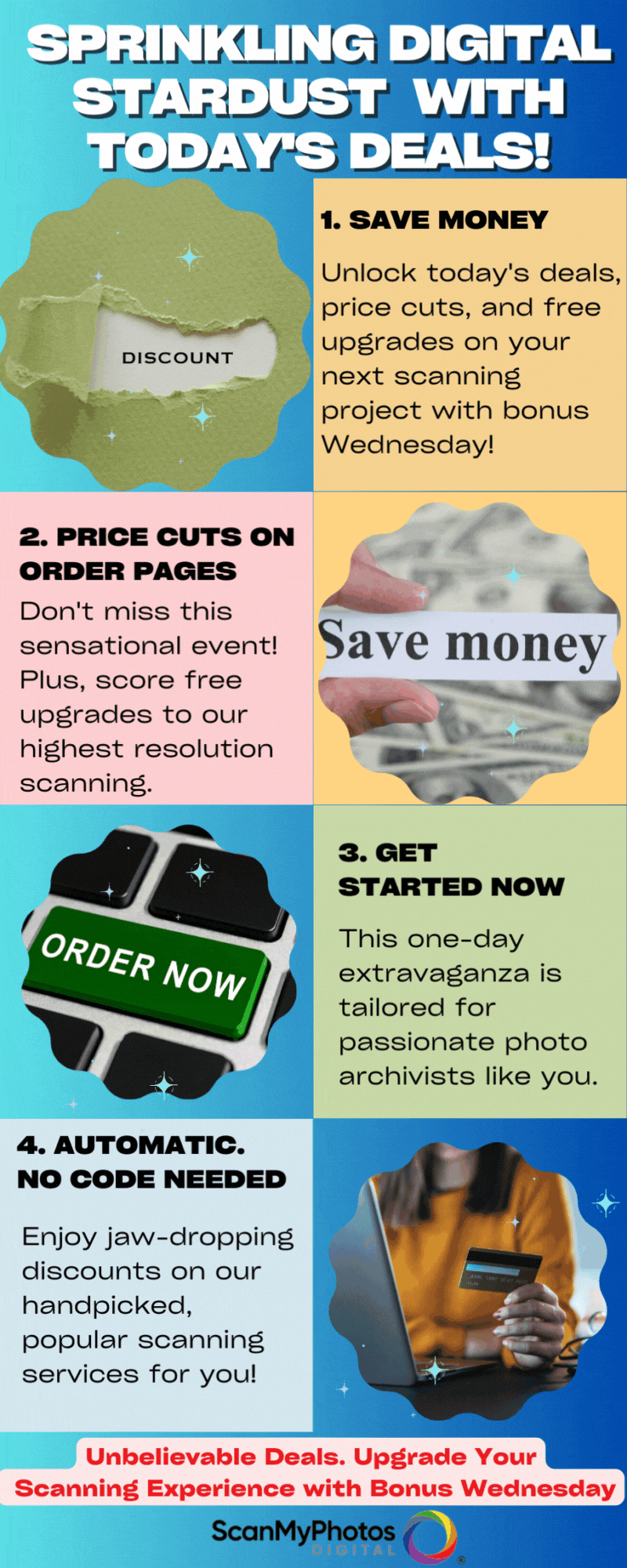 Unbeatable Deals: Save big on popular scanning services and products. See the order pages for today's automatic price discounts—no code is needed. Complimentary Upgrade: Enjoy the highest resolution scanning as a thank you. *Select 600 dpi for photos or 4,000 dpi for slides, and it's the same price as the lower-tier scanning. Limited-Time Offers: Order today to lock in the savings, and then you have nine months to send it in for scanning. New orders only. It cannot be combined with other discounts. Take advantage of this one-day event to preserve your photo memories: Trust us to turn your lifetime collection of photos and slides into digital treasures. Quality Assurance: We're committed to providing top-notch digitization with our 100% happiness pledge guarantee. Ready for Bonus Wednesday: Let's make your photo memories last a lifetime with the ScanMyPhotos magical digital time machine.