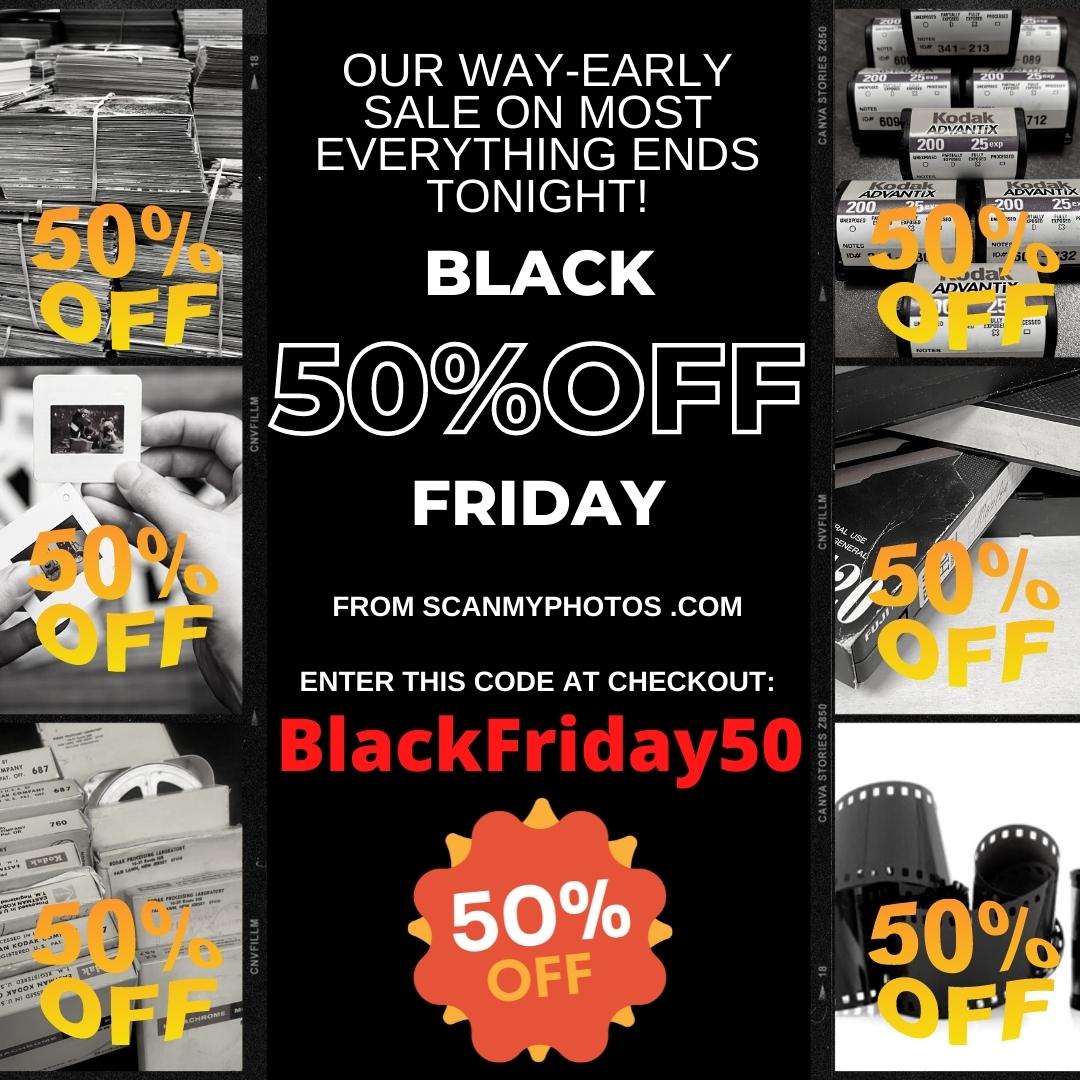 ⏬ HURRY! Expires Tonight ⏬ | | *New Orders Only. Some services are excluded, such as slide carousel scanning, FGC, and eGift Cards. Cannot be applied toward prior purchases At checkout, enter promo code: BlackFriday50 |