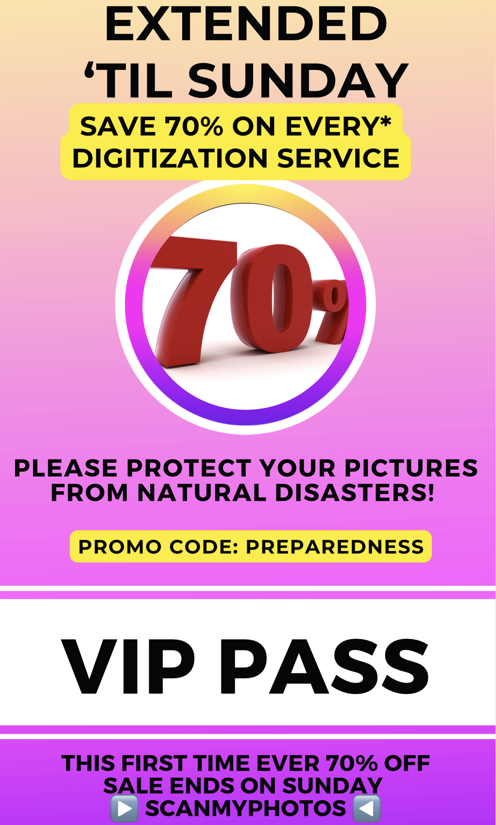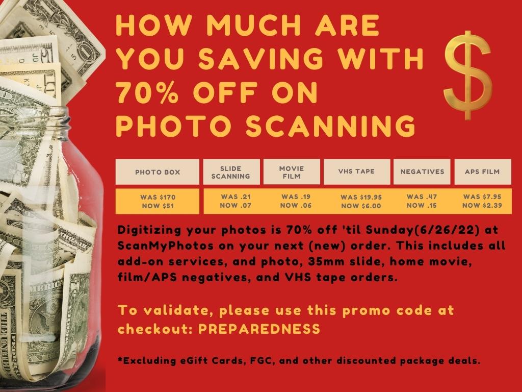 *ScanMyPhotos digitization services are 70% off on your next (new) order placed by Sunday night. This includes all add-on services, and photo, 35mm slide, home movie, film/APS negatives, and VHS tape orders.
