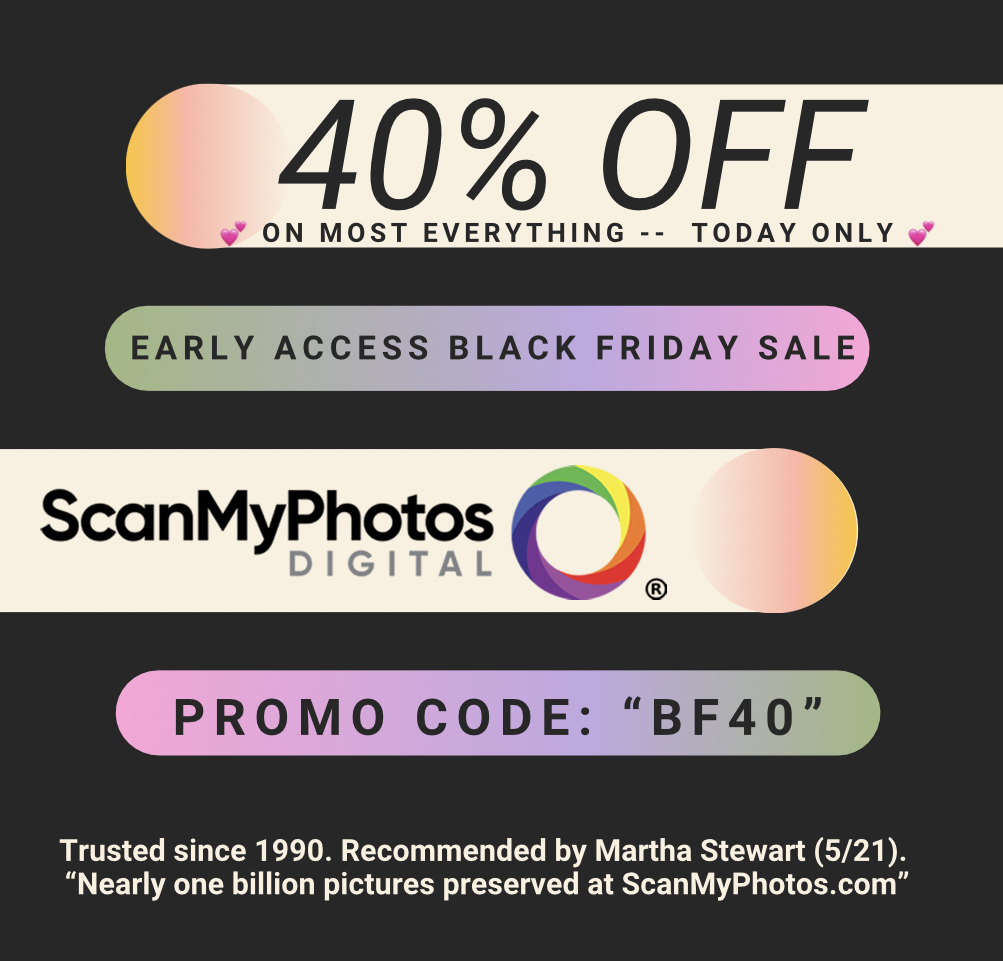 | | | Pre-holiday ScanMyPhotos Deal *40% discount on nearly everything for new orders, cannot be combined with prior discounts. Please widely share as we do no advertising and rely on your personal, much-appreciated referrals. -- Your ScanMyPhotos Family | | | |