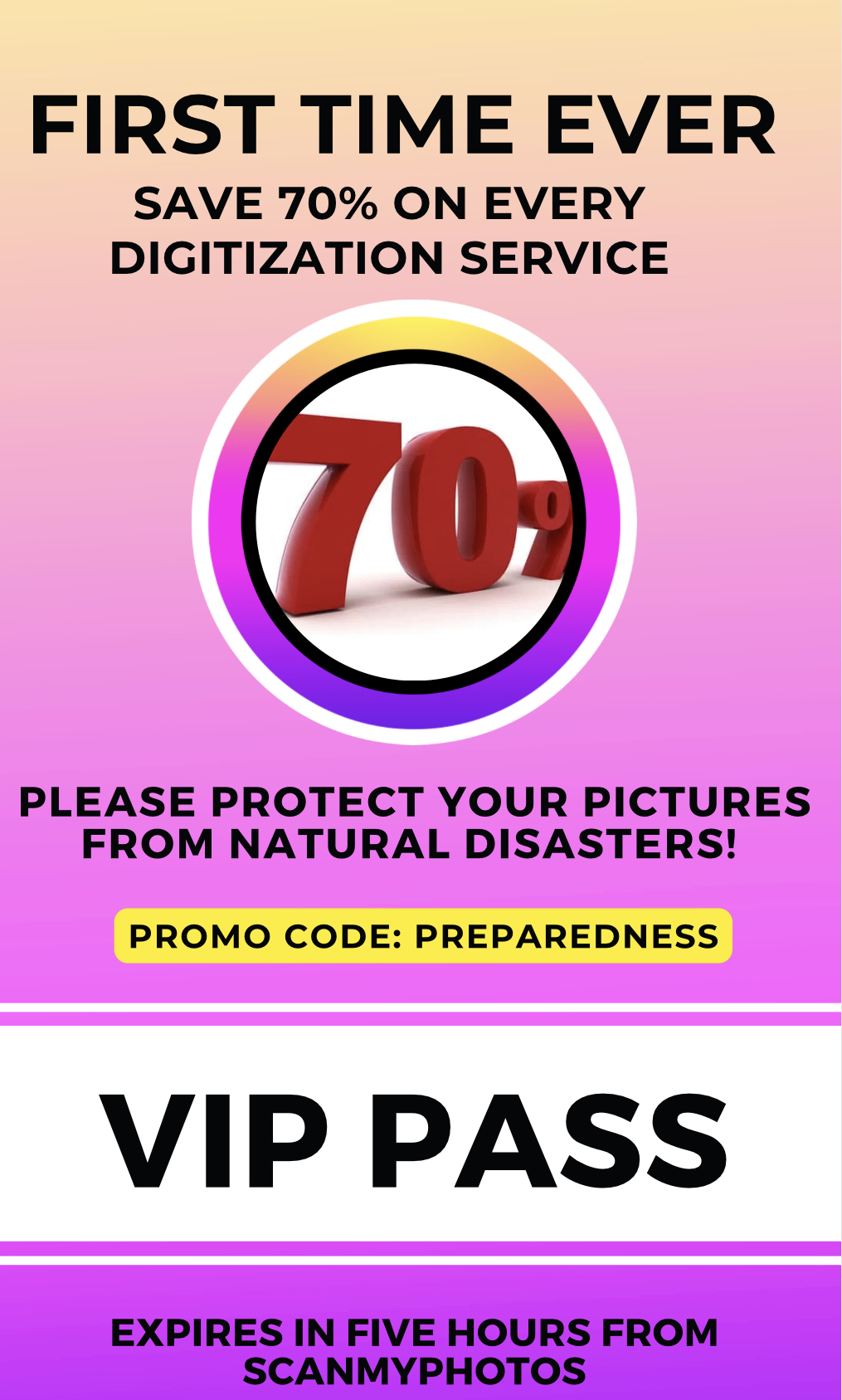 After reading non-stop stories of loss due to natural disasters, new digitization orders are 70% off to end procrastinating. It is more than just an inflation-busting discount. We have never done it before, but it ends in five hours.