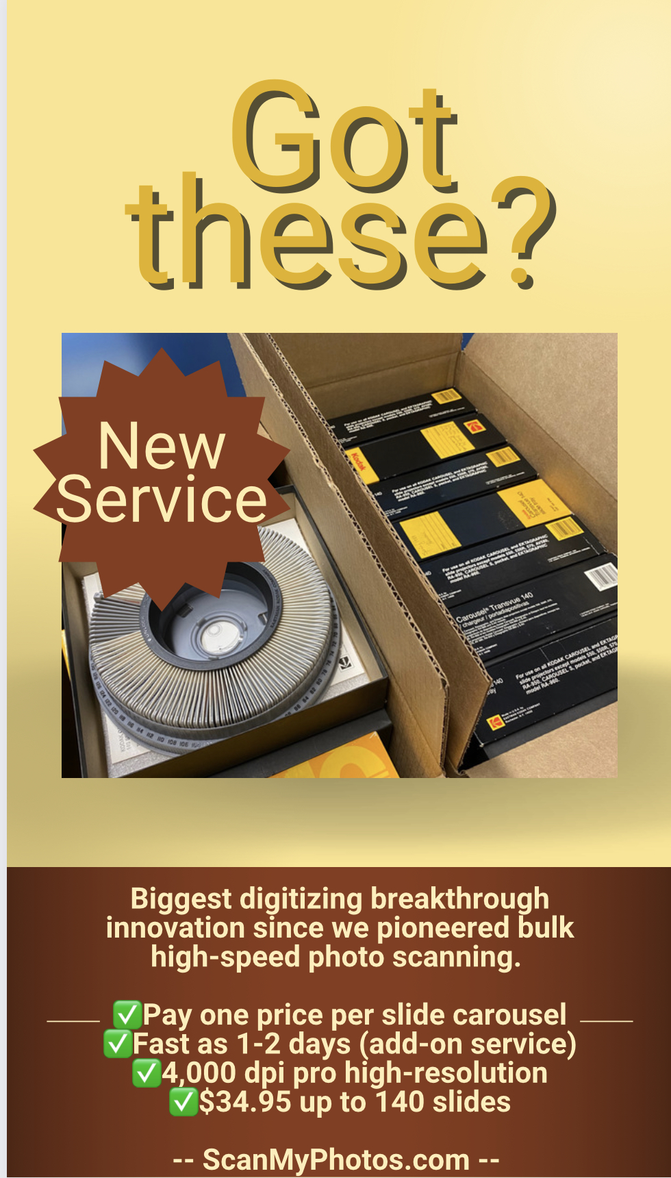 ⏩ FREE RETURN DELIVERY for 20+ carousel boxes ⏩ *FLAT RATE introductory price starting at $34.95 per carousel box (that fits up to 140 slides) ⏩ PROFESSIONAL 4,000 dpi high-resolution digitization ⏩ LOADS OF ADD-ON extra services to enhance your order ⏩ EXPRESS ScanFast 1-2 day scanning (optional add-on) ⏩ THIS NEW SERVICE applies for just standard circular 35mm slide carousels holding from 80-140 slides. New orders only. [*As this is a prelaunch intro announcement, terms and details may change]. |