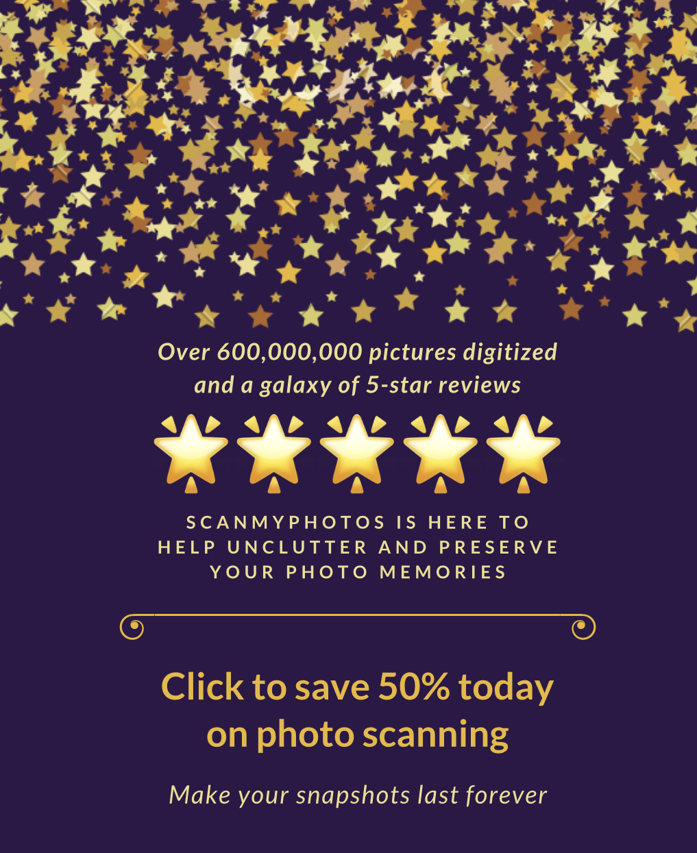 Friend Your 50% discount includes all extras, like express same-day scanning, instant uploading, professional 600 dpi high resolution, and other add-on services. Just enter "50OffScan" at checkout.