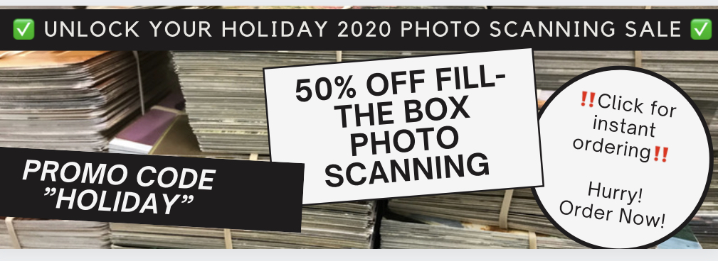 Hello, Friend The worst part of this year was recognizing 40% of all photo scanning projects received are from grieving families preparing for virtual Zoom memorial services--for those lost to Covid-19. Heartbreaking. The helpful news: We added a concierge support desk to help them and added express same-day scanning with instant uploading. More good news: We added back our most popular deal of the year, 50% off fill-the-box photo scanning. Pay as little as $72.50 to have about 1,800 pictures digitized. The discount includes all add-on extras and free delivery. 🔎 *See below for promo code and link for instant ordering. |