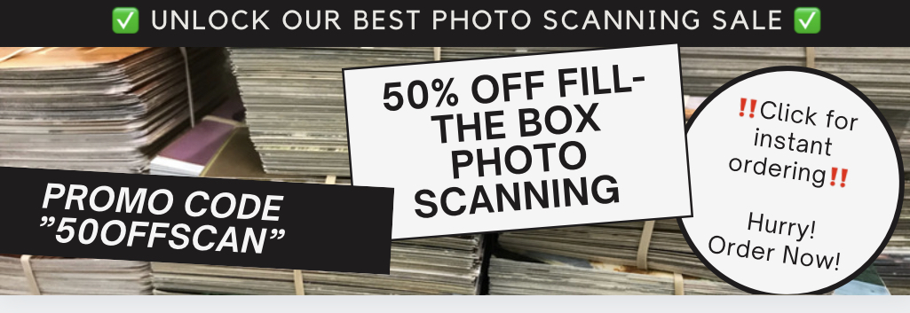 *Pay as little as $85 to have nearly 2,000 pictures digitized with free delivery. Loads of add-on extras are available to enhance your order. Promo code: "50OffScan".