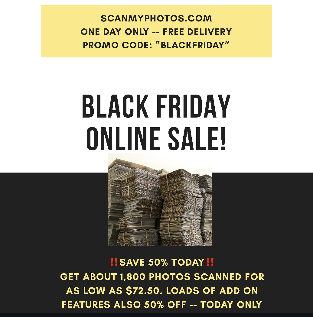 | Free Shipping And 50% Off Fill-The-Box Photo Scanning & All Extras at ScanMyPhotos | Use "BLACKFRIDAY" Promo Code at Checkout | | Order today, we send on Monday. You have nine months to return your fill-the-box photo scanning order | | | | | |